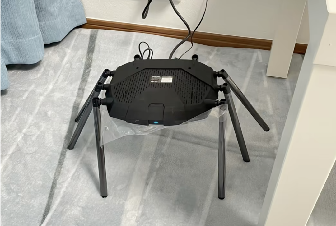 当然了,如果你把路由器摆成这种“赛博蜘蛛”的形状也是完全可以的,因为天线虽然倒过来了,但它本质上也是垂直于地面的。