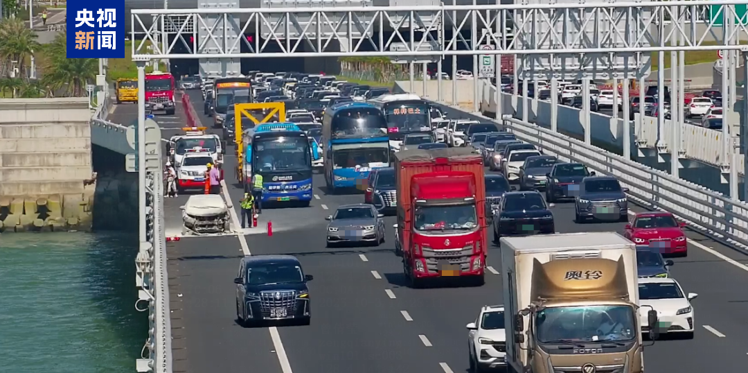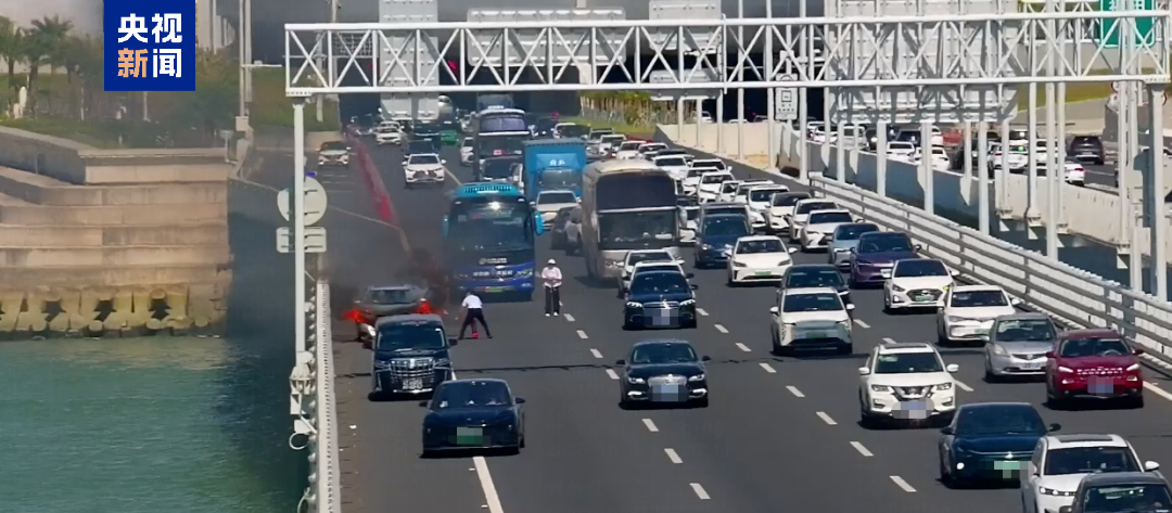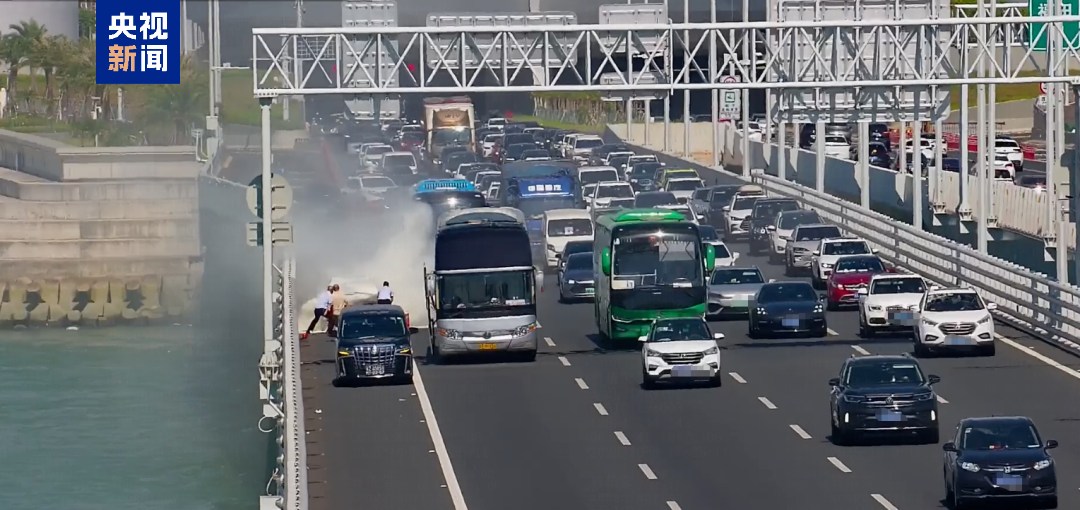 几乎同一时间,一辆蓝色大巴车和一辆黑色商务车停靠在侧,两名司机分别从车上、深中通道桥梁外侧护栏上的消防器材箱取下灭火器,与起火车辆驾驶员共同灭火。